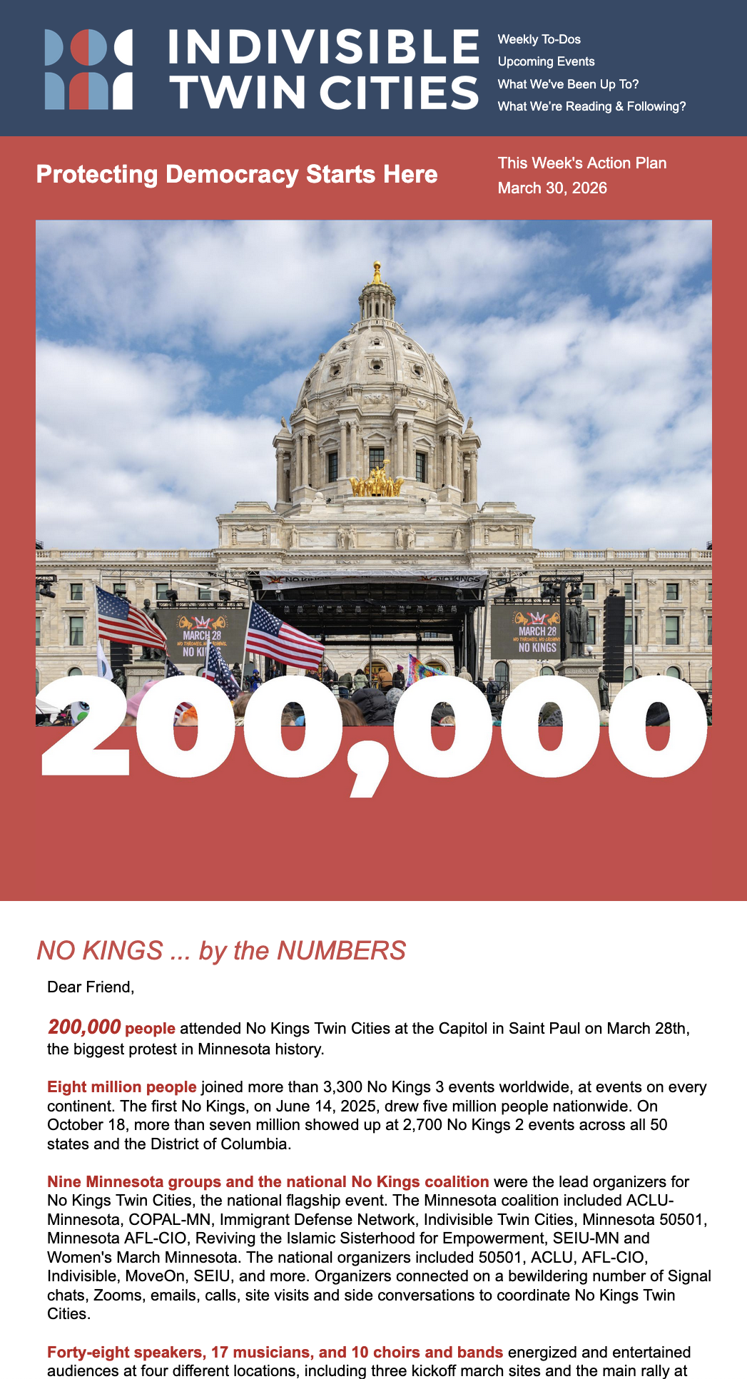 NO KINGS ... by the NUMBERS … 200,000 people attended No Kings Twin Cities at the Capitol in Saint Paul on March 28th, the biggest protest in Minnesota history. … Eight million people joined more than 3,300 No Kings 3 events worldwide, at events on every continent. … Nine Minnesota groups and the national No Kings coalition were the lead organizers for No Kings Twin Cities, the national flagship event. … Forty-eight speakers, 17 musicians, and 10 choirs and bands energized and entertained audiences at four different locations, including three kickoff march sites and the main rally at the Capitol. … One historic day that you can revisit on the live-stream here.