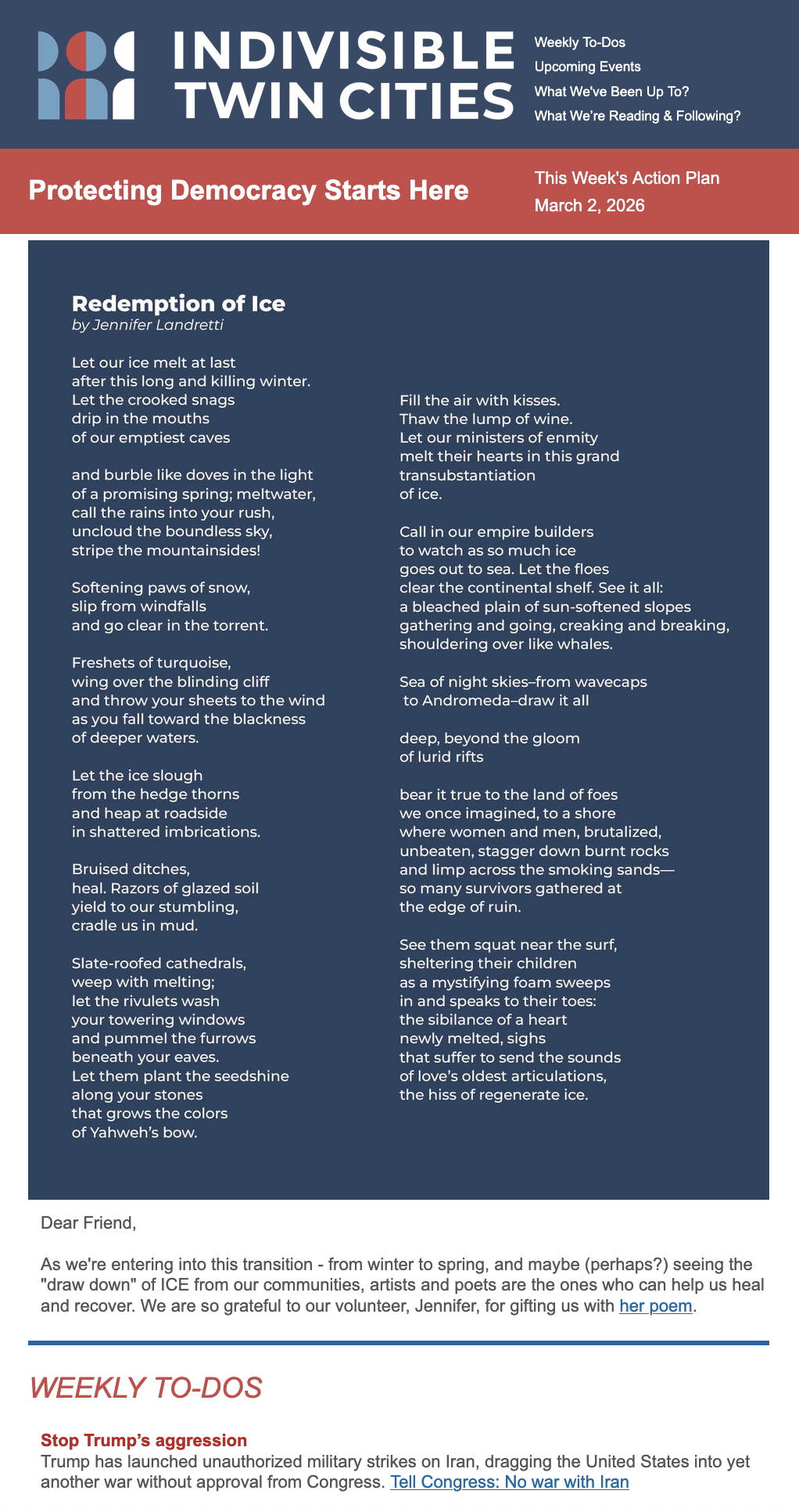 As we're entering into this transition - from winter to spring, and maybe (perhaps?) seeing the "draw down" of ICE from our communities, artists and poets are the ones who can help us heal and recover. We are so grateful to our volunteer, Jennifer, for gifting us with her poem.